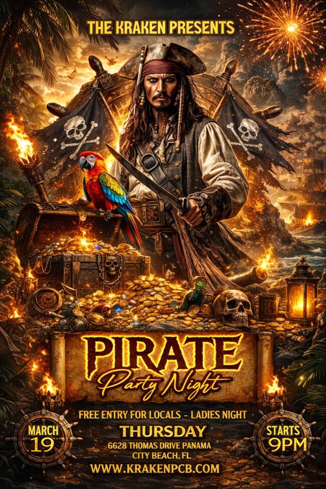 The Kraken presents Pirate Party Night on Thursday, March 19th at 9:00pm! Free entry for locals + LADIES’ NIGHT!