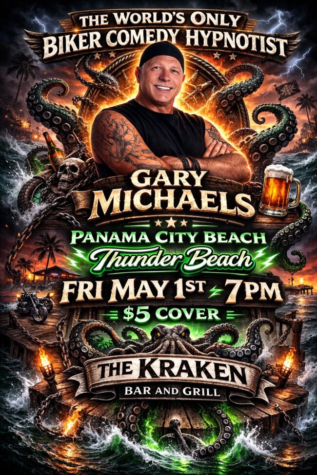Join us for a unique and fun experience on Friday, May 1st, 2026 at 7:00pm led by Gary Michaels, the world’s only biker comedy hypnotist!! ONLY $5 COVER!